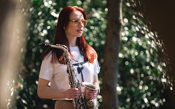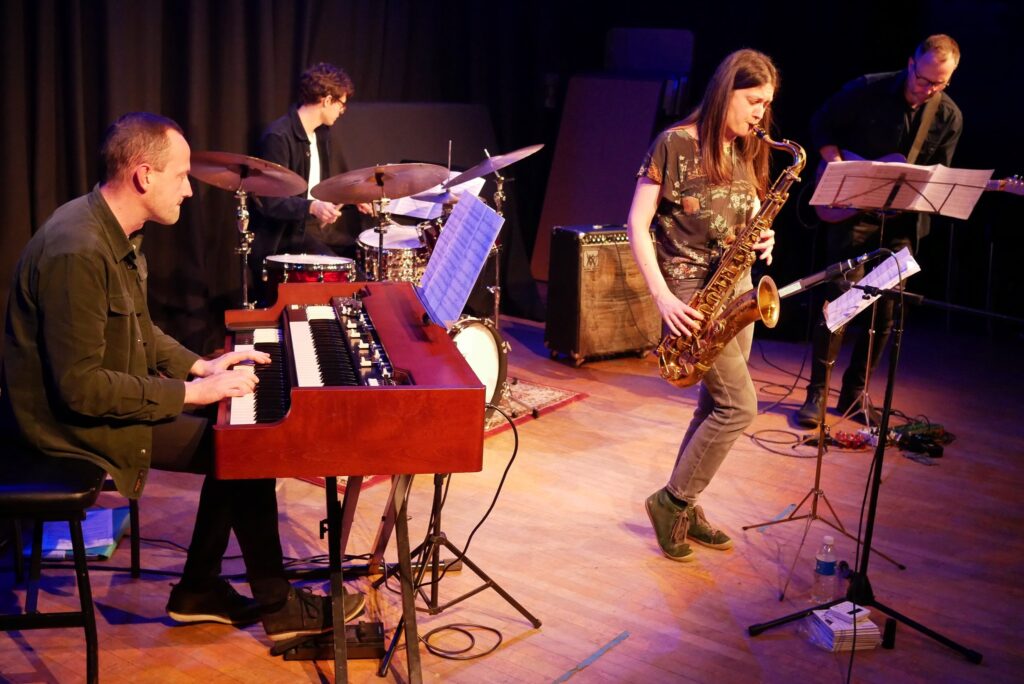 Saxophonist and composer Trish Clowes leads her quartet MY IRIS, with Chris Montague (guitar), Ross Stanley (piano/Hammond organ), and Joel Barford (drums).